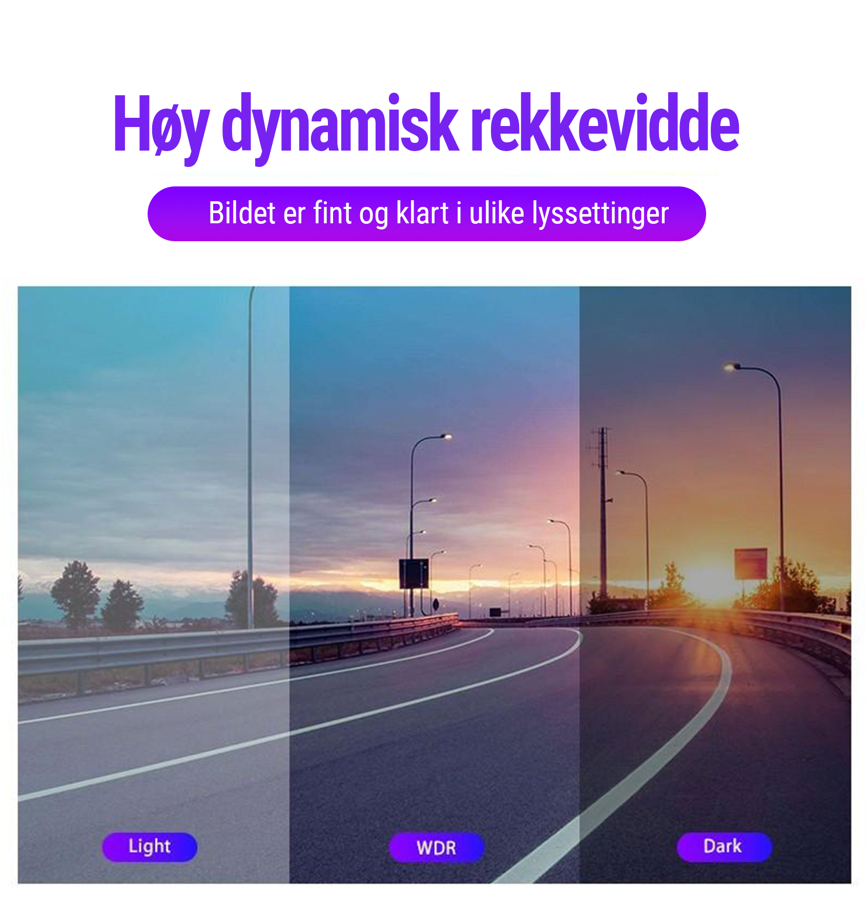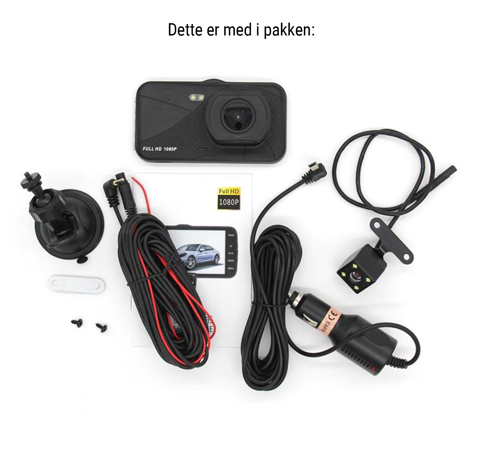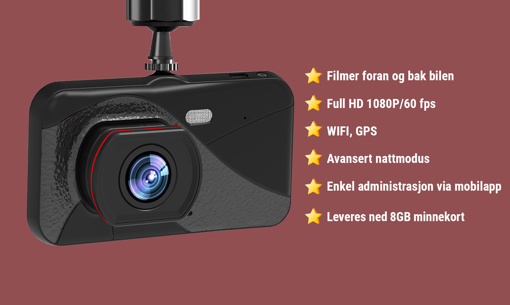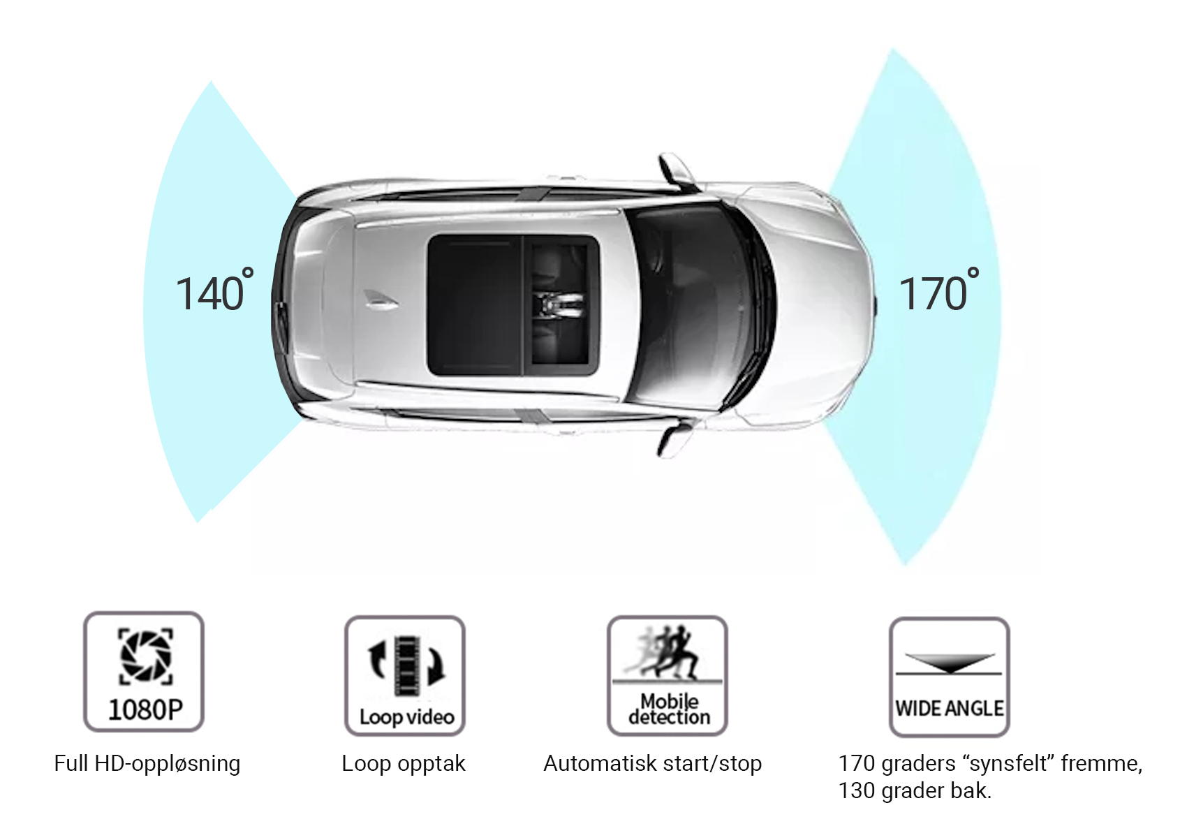 - Kamera starter automatisk når du starter bilen og har innebygd støt- og bevegelsesdetektor.